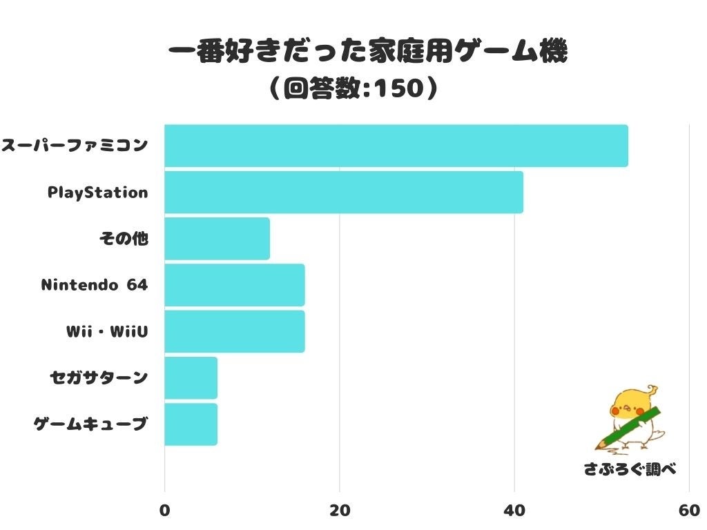 2位以降は、「PlayStation」、「Nintendo 64」と続き、「セガサターン」「ゲームキューブ」は同率5位という結果になりました。
