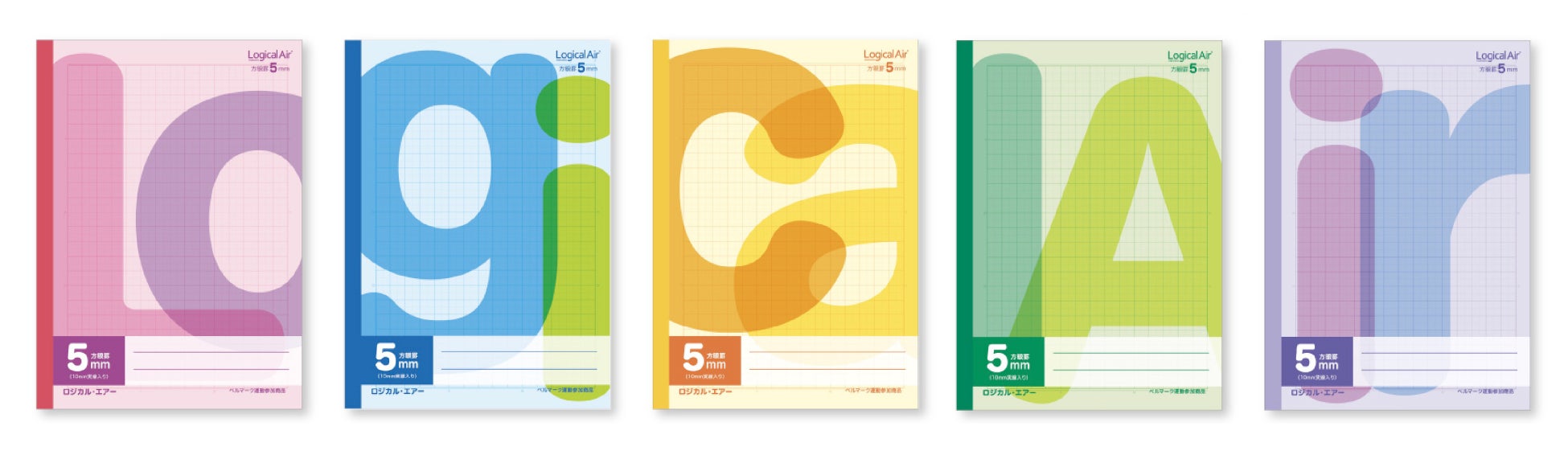 ロジカル・エアーの英字の書体をポップに表したカラフルなデザイン。明るいカラーがロジカル・エアーのイメージにぴったりなノートです。5色にわかれているので、科目ごとにノートを使い分けることができます。