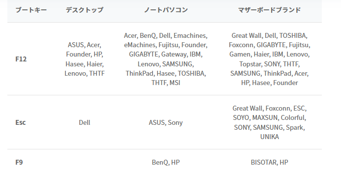 Step4: 起動しないパソコンに作成したCD-ROMまたはUSBを挿入し、パソコンを起動。この時、起動メニューに入るためにキーボードの「F12」または「ESC」を押しながら起動する必要があります。お持ちのパソコンに当てはまるキーを確認の上お試し下さい。