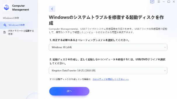 PassFab FixUWinは起動できないハードディスクのデータの回復やWindowsのログインバスワードを忘れてしまった場合の回復にも使える専門ツールです。それだけでなく、もしWindowsがブラックスクリーン、ブルースクリーンになった場合、同ソフトを使うと簡単にWindowsを修復できます。同ソフトについては作業中も画面にはガイダンスが表示されるので作業を進めやすいですが、ここでは全体の流れをご説明します。対応手順は、以下の通りです。
