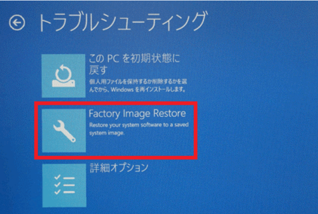Step3:「トラブルシューティング」が表示されたら「Factory Image Restore」をクリック。(ハードディスクのリカバリー領域に格納されている、「工場出荷時イメージ」から復元することを意味しています。)