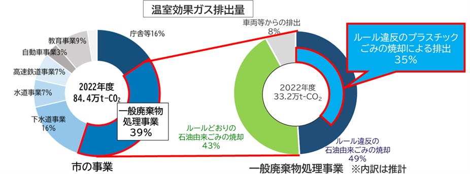横浜市が排出する温室効果ガスのうち、ごみ処理に伴って排出される量は約4割(年間33.2万トン)を占めています。このうち、焼却処理されるごみに混入したルール違反のプラスチックごみが約35%を占めていると推計しており、主な排出要因となっています。この状況を把握したうえで、市民・事業者へ、より一層の行動の変化を促していく必要があります。