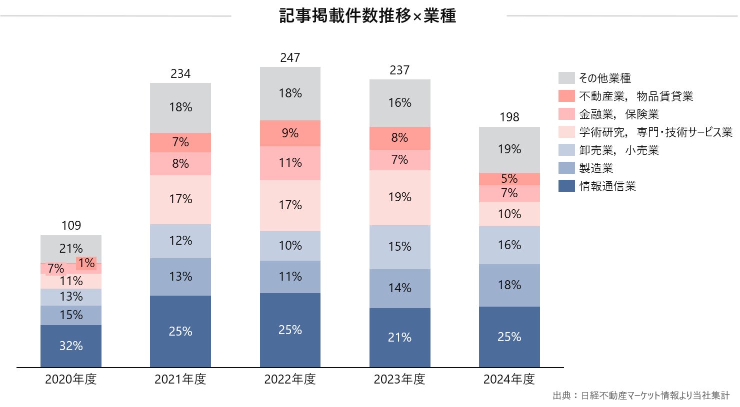 2024年度の日経不動産マーケット情報移転記事掲載件数は198件となり、2022年度以降は減少傾向となっている。