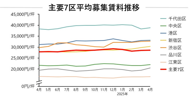 主要7区の平均募集賃料は28,643円/坪で前月比+136円/坪。