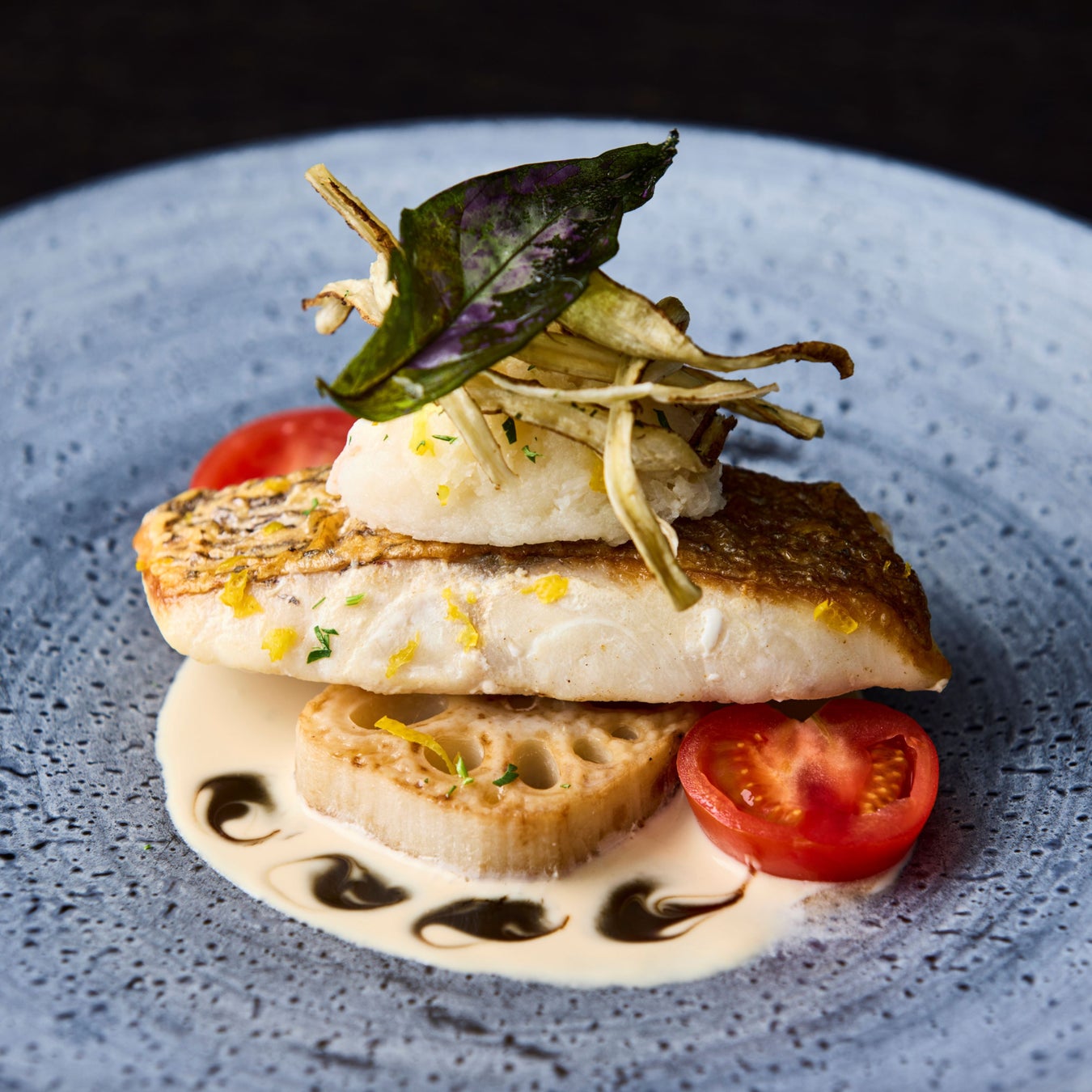 付け合わせには、コクと甘みがギュッとつまった「高知県産フルーツトマト」と石川県の伝統加賀野菜の「加賀れんこん」を使用しています。フルーツのようなトマトの濃厚な甘みと程よい酸味のバランスが良く、果肉感をしっかり味わっていただきたいので厚めにスライス。どの付け合わせもジューシーな真鯛と相性が良く、それぞれの食材の良さがより引き立ちます。アクセントに、非常に香り高い高知県産の柚子皮をまぶして、柚子のさわやかな香りもお楽しみいただける一皿です。