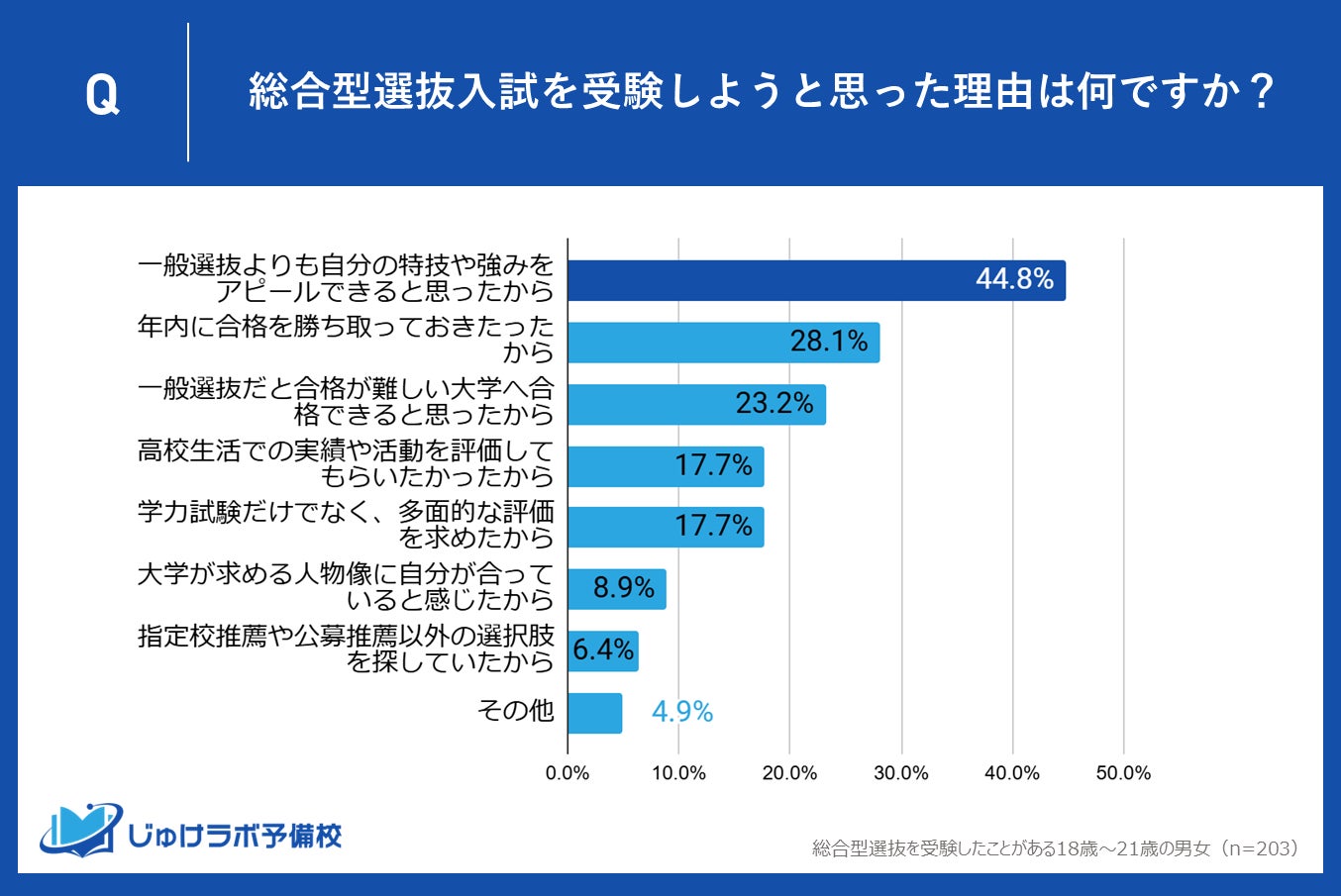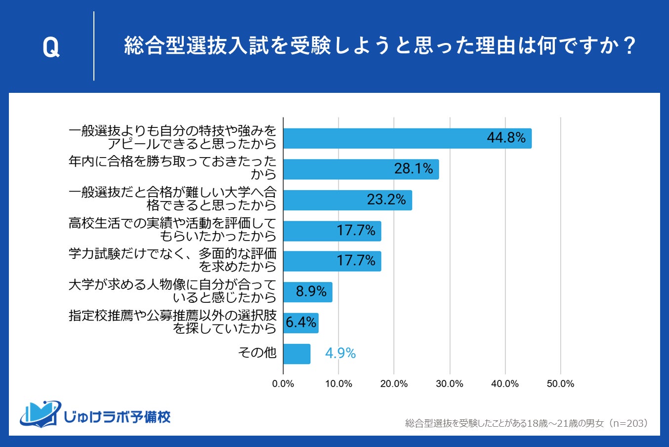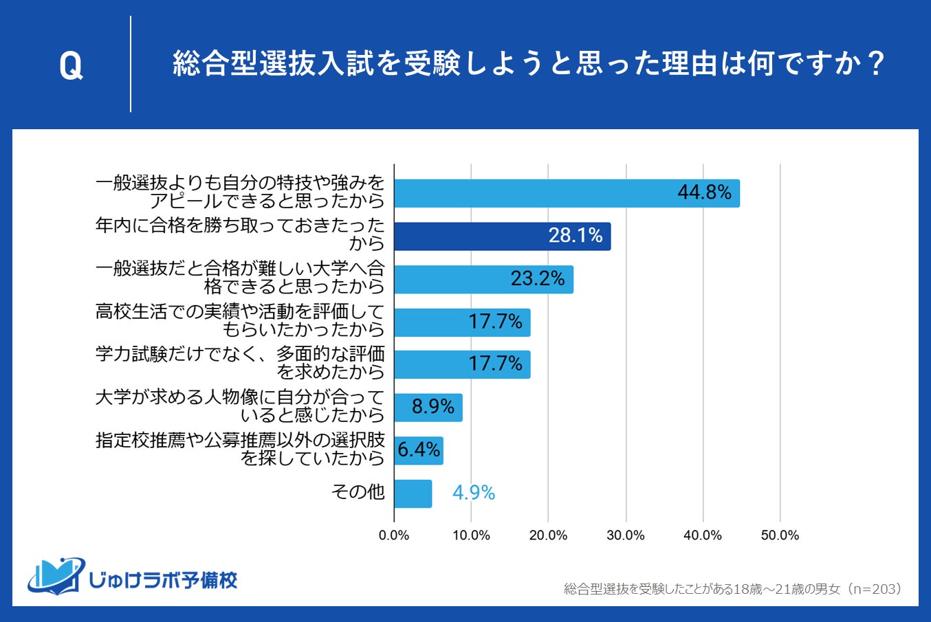 その結果、最も多かった理由は「一般選抜よりも自分の特技や強みをアピールできると思ったから」で、全体の44.8%を占めました。また、「年内に合格を勝ち取っておきたかった」(28.1%)や、「一般選抜だと合格が難しい大学へ合格できると思った」(23.2%)など、受験生の戦略的な選択が見えてきました。