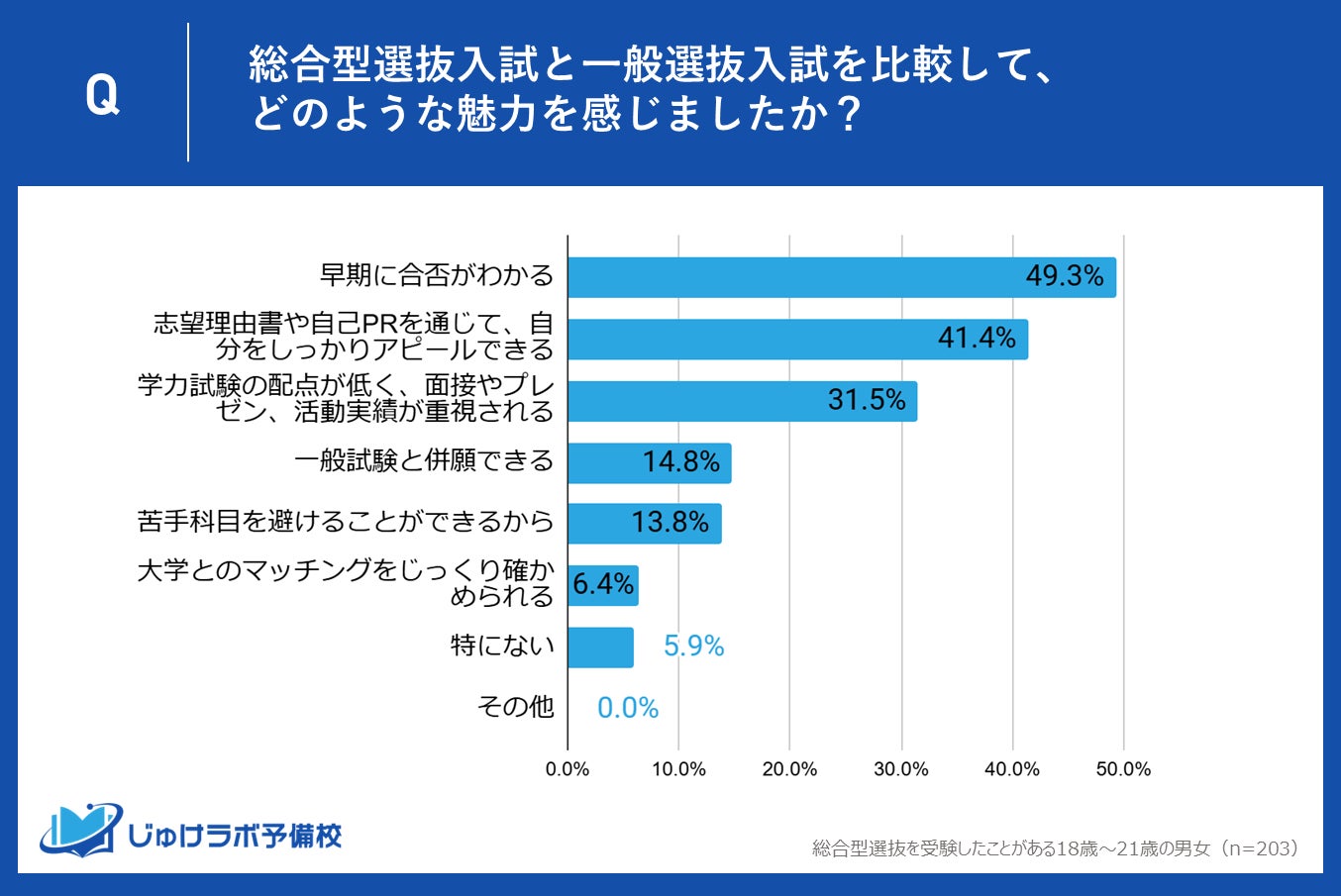 次に「総合型選抜入試と一般入試を比較した際に感じた魅力」について調査を実施したところ、最も多かった回答は「早期に合否がわかる」(49.3%)という結果になりました。