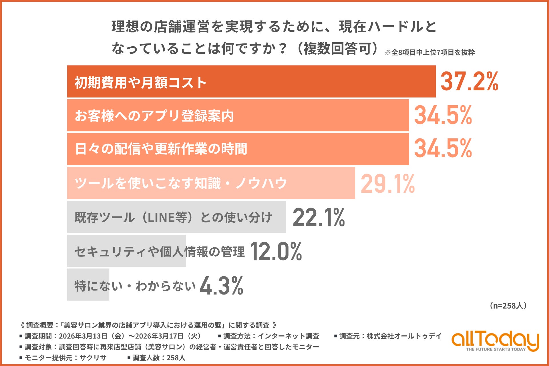 株式会社オールトゥデイ(本社所在地:埼玉県さいたま市)は、再来店型店舗(美容サロン)の経営者・運営責任者を対象に、「美容サロン業界の店舗アプリ導入における運用の壁」に関する調査を実施しましたので、その結果を公表します。