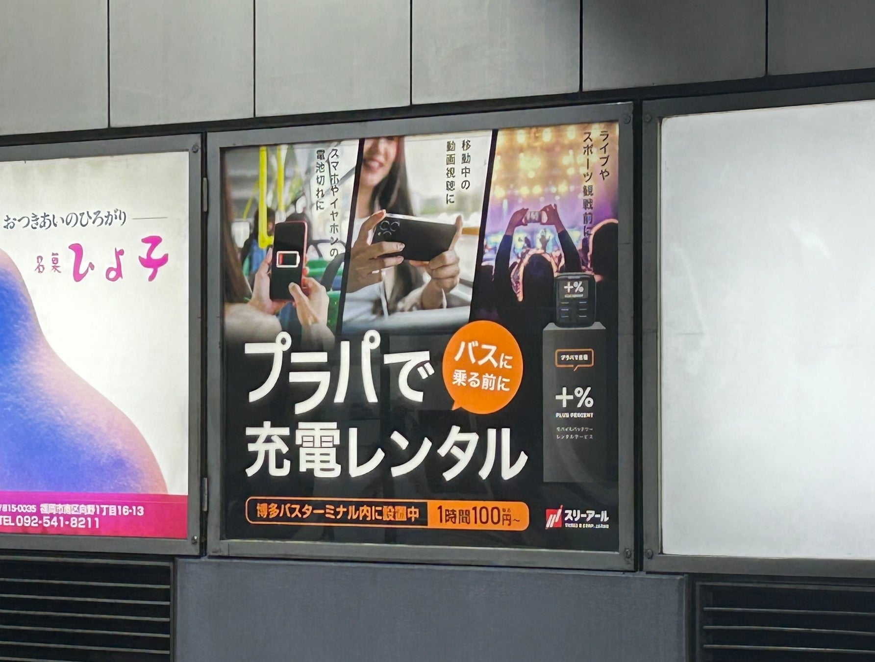 スリーアール株式会社(本社:福岡市博多区、代表取締役社長:今村陽一)は、福岡の主要交通拠点である博多バスターミナルに、モバイルバッテリーシェアリングサービス「+% PLUS PERCENT(プラスパーセント)」(以下「プラパ」)を2025年10月より設置いたしました。