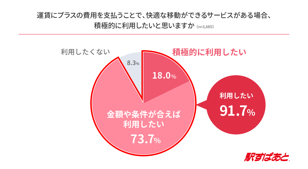 運賃にプラスの費用を支払う事で、快適な移動(混雑を回避、座席グレードが上がる等)ができるサービスを積極的に利用したいか、という質問には18.0%の人が「積極的に利用したい」と回答しました。「金額や条件が合えば利用したい」と回答した人も含めると、9割以上の人が快適な移動サービスにはプラスの費用を容認しています。一方、「利用したくない」と回答した人はわずか8.3%でした。