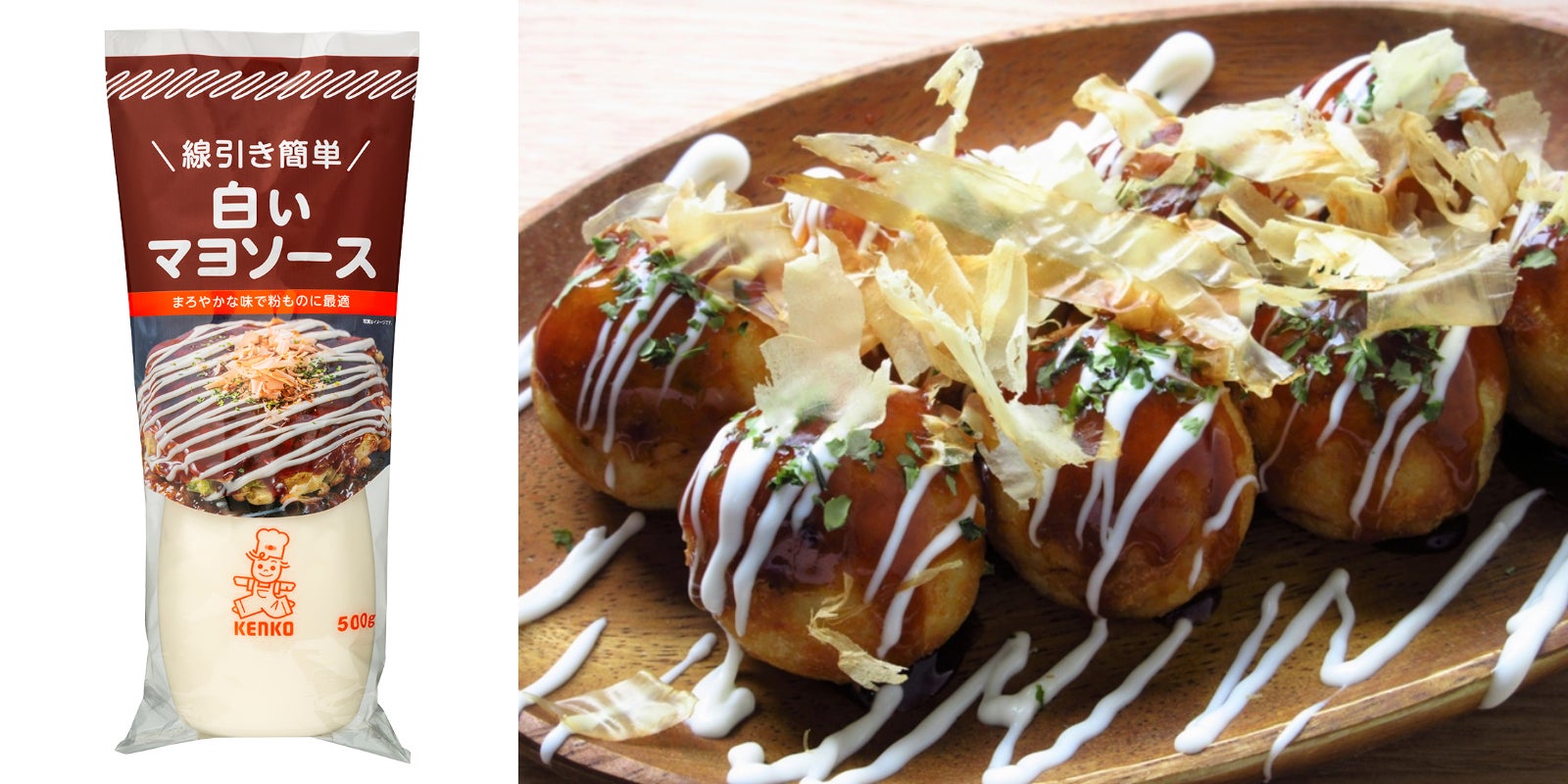 酸味が立たない、まろやかな味わいの白いマヨソースがたこ焼きソースと相性抜群です。ソースとの色のコントラストも美しく、見た目も華やかに仕上がります。