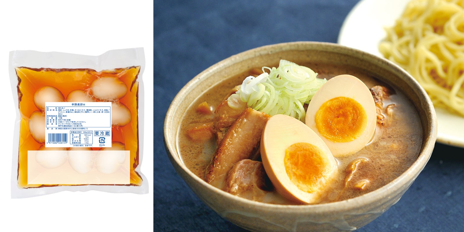 メニューの魅力をぐぐっとアップさせてくれる半熟の味付き煮卵。しょうゆをベースにかつおと昆布の風味を黄身までしっかりと染み込ませました。殻を剥く、味を染み込ませるといった手間が省け、ラーメン、丼、お弁当などに幅広くお使いいただけます。