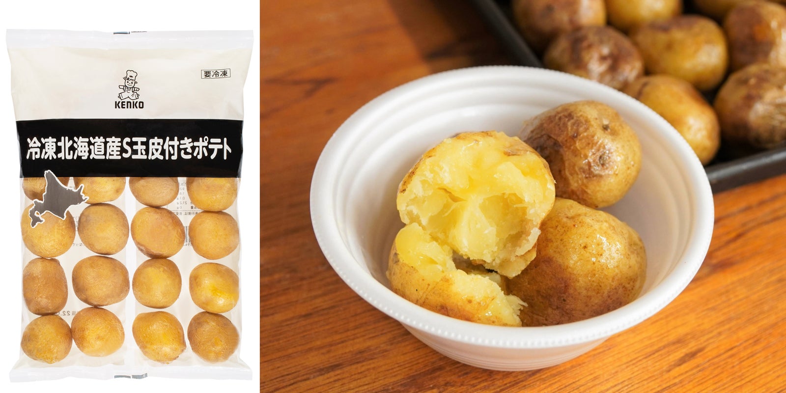 北海道産黄色系品種のSサイズを使用。暖かみのある色調でメニューを明るく彩ります。温めるだけで、じゃがいもの風味やホクホクとした食感をお楽しみいただけます。必要な分だけ使える便利な商品です。