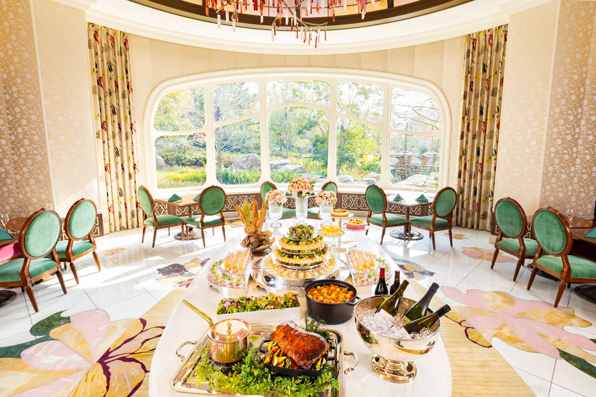 東京ディズニーシー・ファンタジースプリングスホテルのファンタジースプリングス・レストラン(ブッフェ)では、ブッフェスタイルの料理に加え、月替わりでヨーロッパ各国のテイストを取り入れたアミューズやメインディッシュをご用意し、ゲストの皆さまの“食の旅”に彩りを添えます。また、ご自身で料理に合わせたワインをお選びいただき、自分だけのペアリングをお楽しみいただけます。