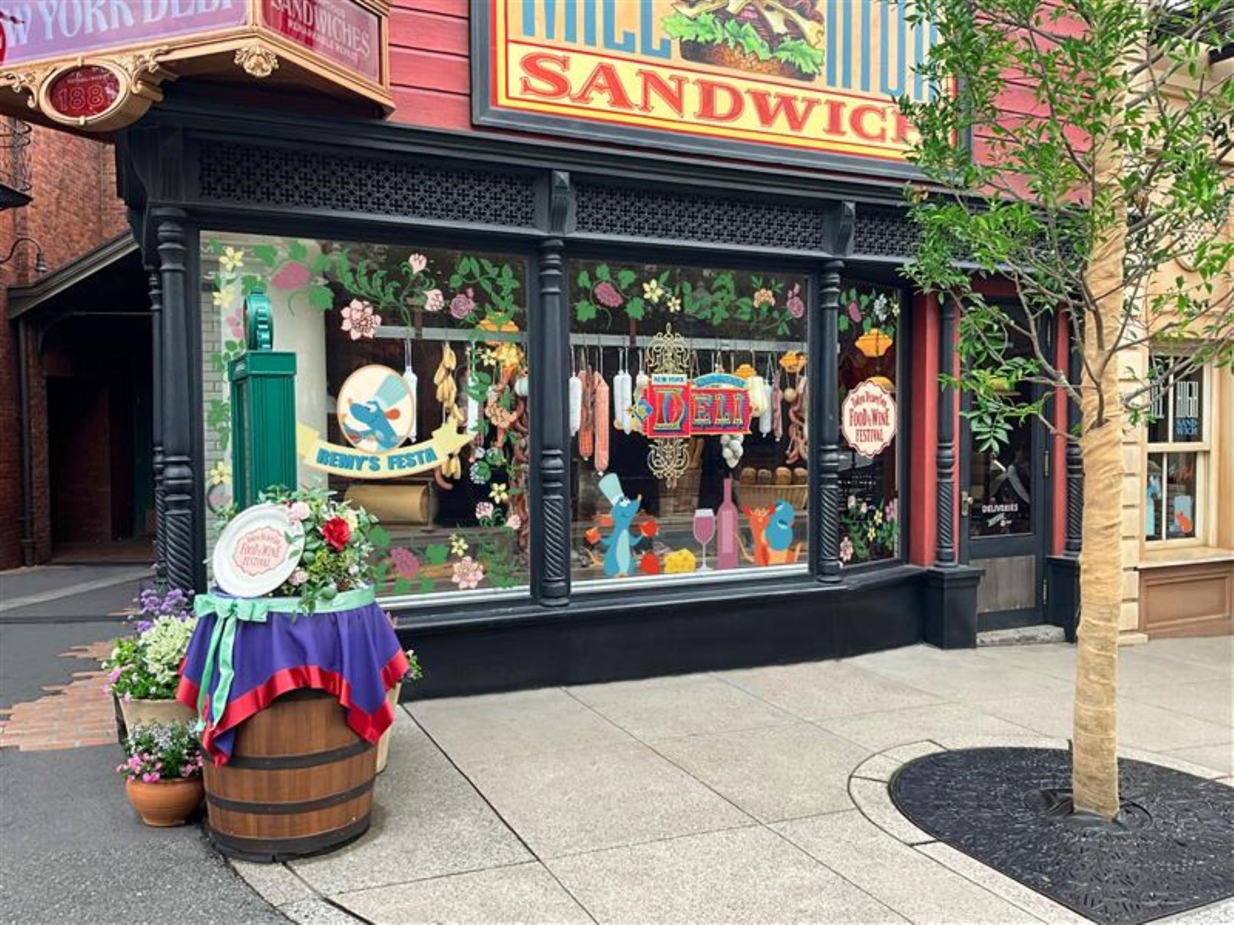 フェスティバルの中心となるアメリカンウォーターフロントのニューヨークエリアでは、春の訪れを感じさせる色とりどりの花々や、ワイン樽をモチーフにしたデコレーションに加え、ディズニーの仲間たちがフェスティバルを楽しむ様子を描いたバナーがエリアを彩ります。