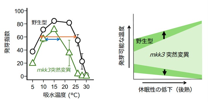 左図の「発芽指数」は、発芽率と発芽速度の両者を加味し、発芽のしやすさを評価する指標。数値が高い方が発芽しやすいことを示す。mkk3突然変異体種子では、野生型種子よりも発芽可能な温度範囲(オレンジの矢印が野生型、青が突然変異体)が狭い。右図では、後熟に伴う発芽可能な温度範囲の拡大を模式的に表している。