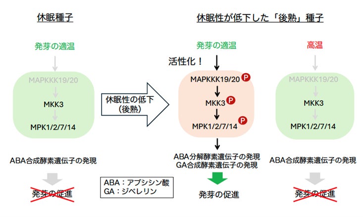 今回の研究から、休眠性が低下した後熟種子が発芽の適温を感知すると、MAPKKK19/20遺伝子の発現を誘導することによりMKK3-MAPキナーゼカスケードを活性化し、植物ホルモンの作用制御を介して発芽を促すと考えられます(図5)。一方、収穫直後の種子は、後熟種子の発芽の適温(25℃前後)で吸水してもMAPKKK19/20遺伝子の発現が誘導されず、MKK3-MAPキナーゼカスケード の活性化が起こらないため、発芽できないと考えられます。