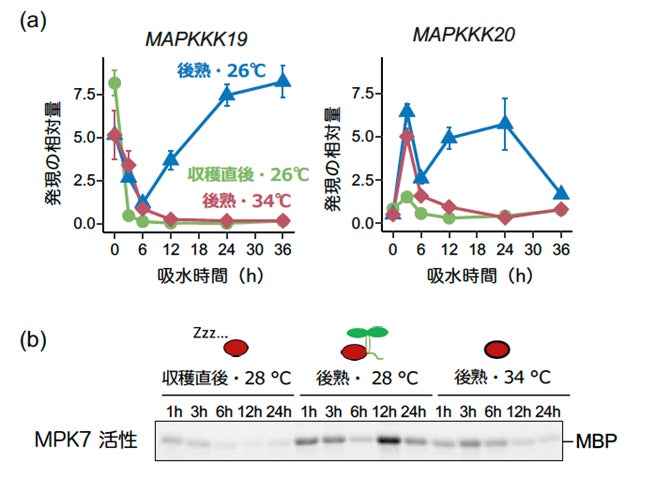 (a) MAPKKK19とMAPKKK20遺伝子の発現を、発芽抑制条件(収穫直後の休眠種子を26℃、休眠性が低下した「後熟」種子を34℃で吸水)と、発芽誘導条件(後熟種子を26℃で吸水)で調べた。