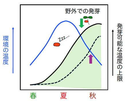 種子が発芽する時季の決定は、その後の個体の成長のみならず、種の存続をも左右します。たとえば、暑さに弱い植物が春に芽生えてしまうと、花を付ける前に枯れてしまったり、花は咲いても種子が実らなかったりします。種子は、たとえ発芽に適切な環境でも発芽を抑える「休眠性」を持ち、環境(土壌)の温度を感知することにより、生育に不適な季節の発芽を抑え、適切な季節の発芽を実現しています。たとえば、秋に発芽して春に種子を付ける「冬型一年生草本」の種子は、春から秋にかけて、休眠性の低下と共に発芽可能な温度の上限を上昇させ、土壌温度が上限を下回る秋に発芽します(図1)。この場合、休眠性の低下は、発芽可能な温度範囲の拡大と発芽至適温度の上昇によってもたらされます。もし、発芽可能な温度範囲が狭まると、発芽の時季がずれ、期間も限定されてしまうでしょう(図1:実線から点線、緑から紫の矢印へ)。これまでに、発芽の至適温度を制御する遺伝子は見出されていますが、発芽可能な温度範囲を調節する仕組みは知られていませんでした。