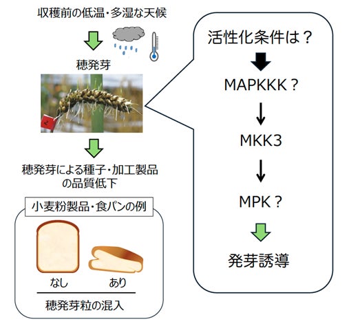収穫前の多湿な環境では、種子が母体についたまま発芽してしまう「穂発芽」が誘導されることがある。コムギでは、穂発芽粒を含んだまま製粉してしまうと、デンプン等が分解され、加工食品の品質が劣化してしまう。穀類の穂発芽耐性に品種間差をもたらす遺伝子の一つとしてMKK3が同定されている。