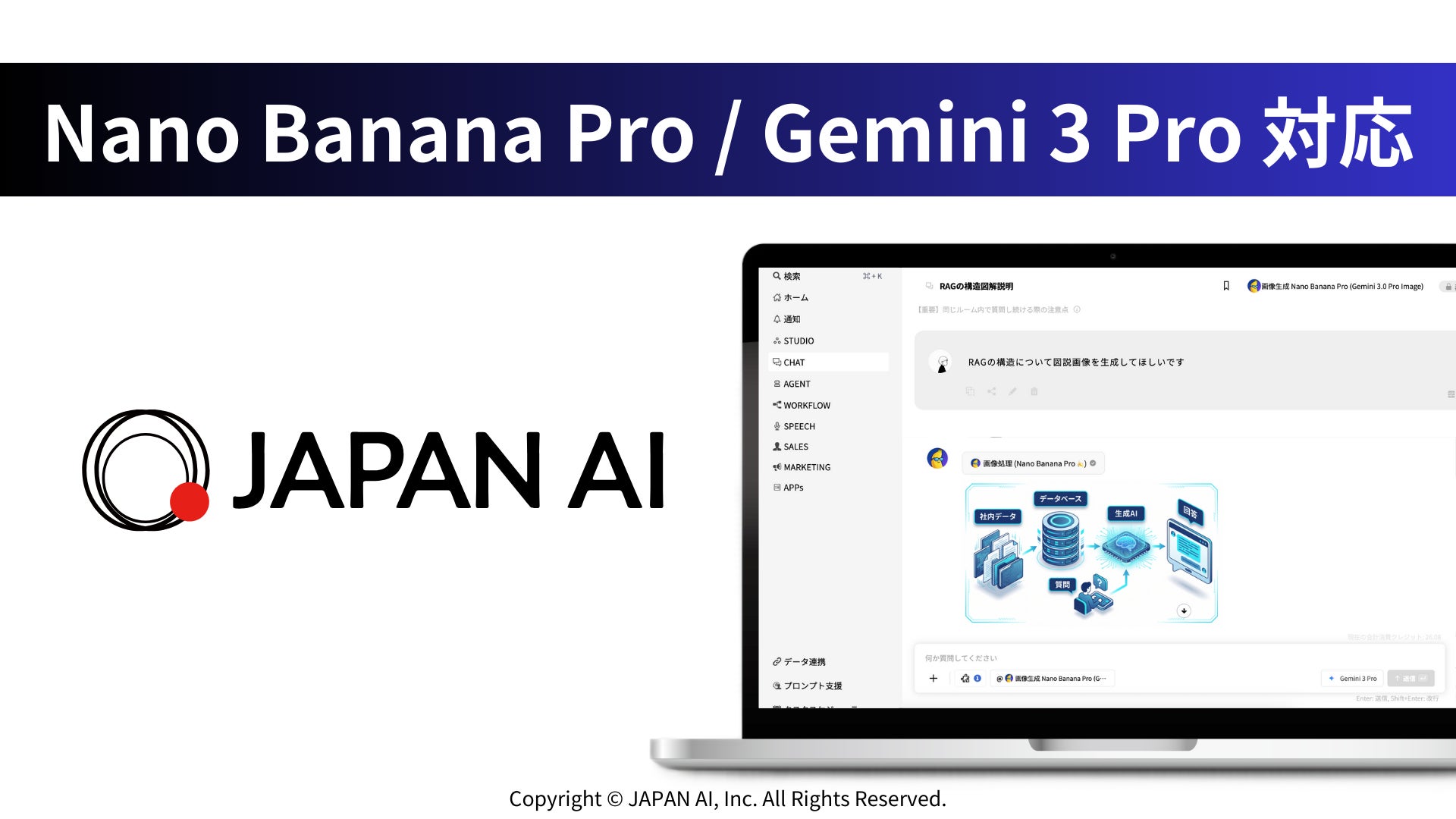 JAPAN AI株式会社(本社:東京都新宿区、代表取締役社長:工藤 智昭、以下JAPAN AI)は、Googleの最新AIモデル「Gemini 3 Pro」と画像生成AIモデル「Nano Banana Pro」 に対応したことをお知らせします。