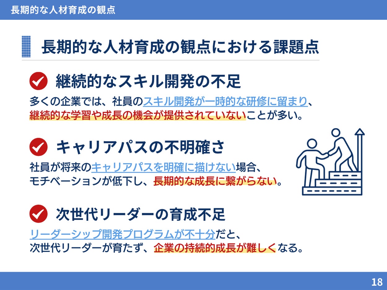 しかし、継続的なスキル開発の機会や明確なキャリアパスの設定、リーダーシップ開発プログラムが不足している場合、次世代リーダーの育成が進まず、企業の成長が停滞するリスクがあります。また、これらの要素が欠けることで、社員が将来の成長に対するモチベーションを失い、結果として企業全体の持続可能な成長が妨げられる可能性もあります。