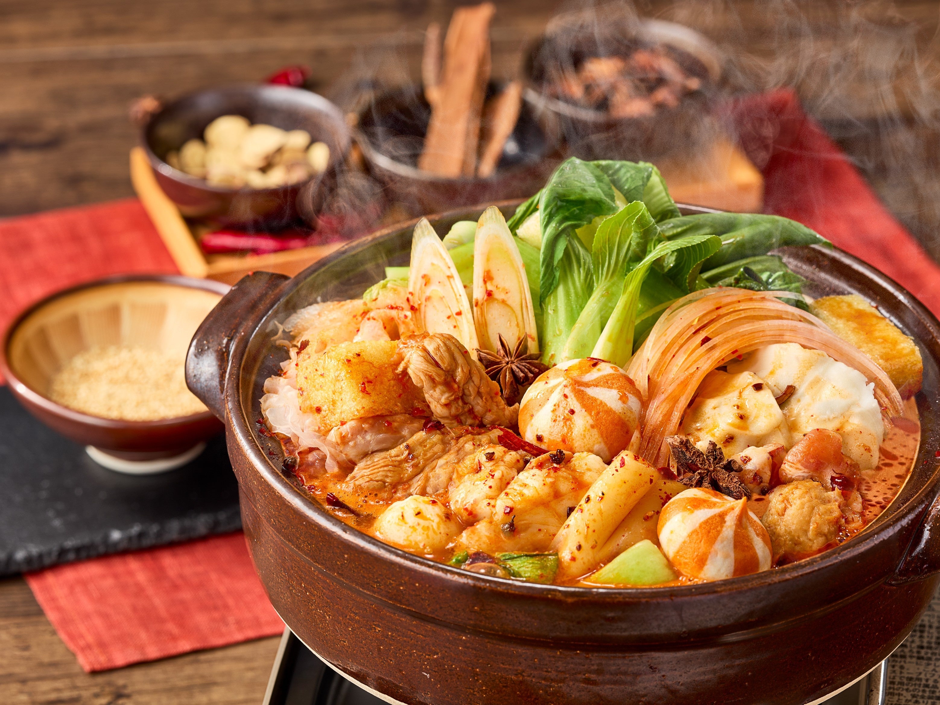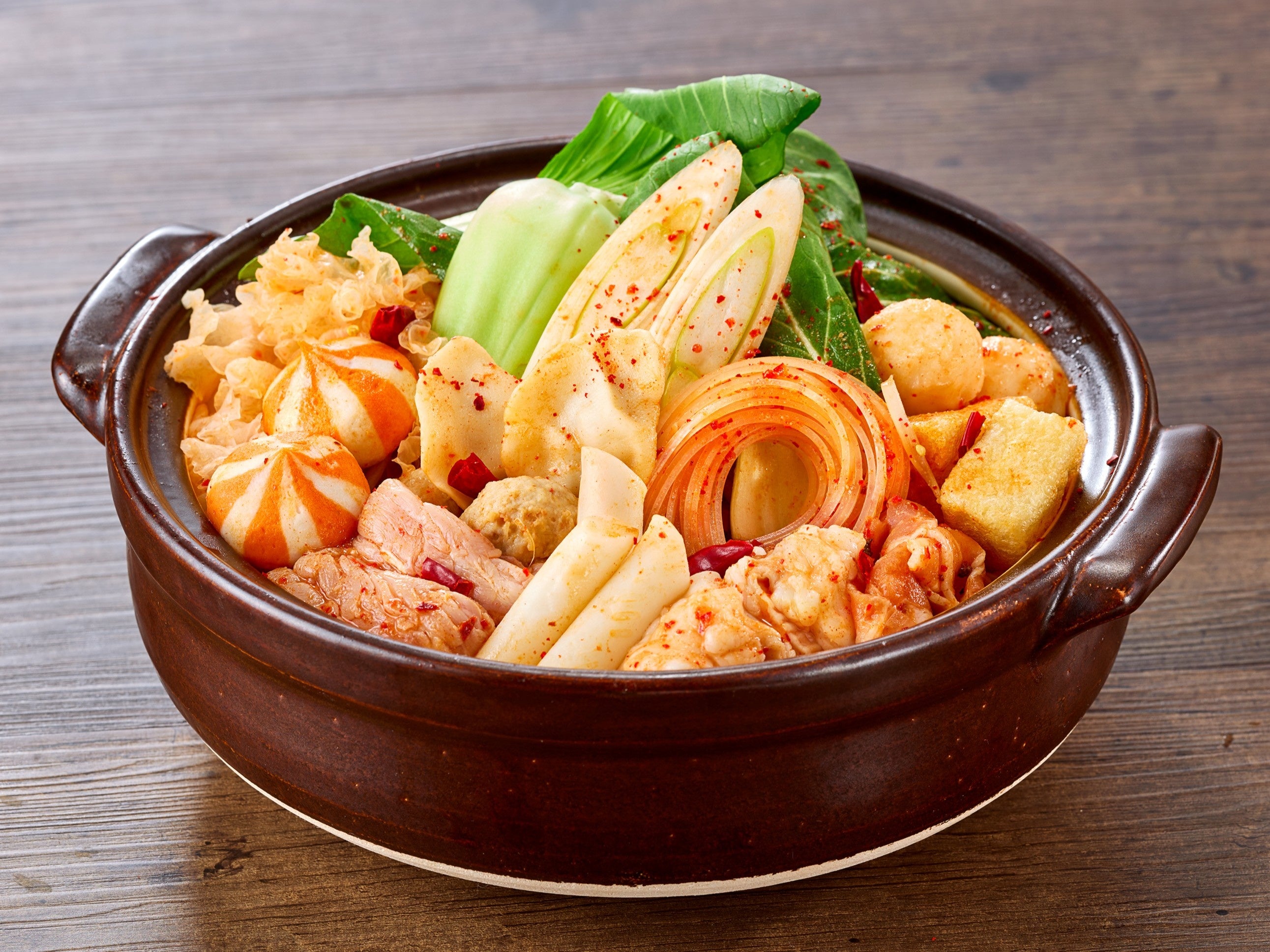 具材には、赤から鍋でも定番の国産牛ホルモンや豚バラ、つくね、油揚げなどに加え、白きくらげや蟹だんご、チンゲン菜など、麻辣湯でもおなじみの食材をラインナップ。さまざまな食感と旨みがスープに溶け込み、最後までお楽しみいただける一品です。