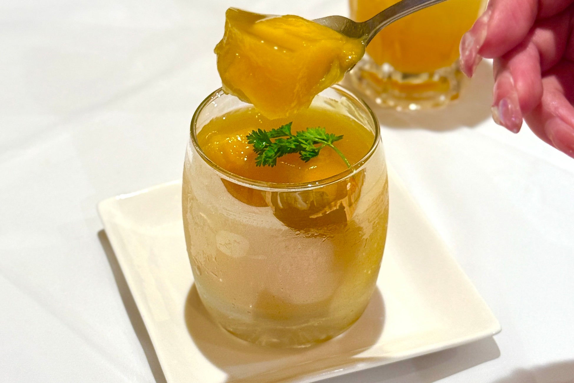 食後のスイーツには、本場インド産の“マンゴーの王様”と称されるアルフォンソマンゴーを使用したマンゴージェラートが登場しました。濃厚ながら後味はすっきりとしており、暑い日でも食後にも食べやすい本格派ジェラートです。さらに、果汁100%のブレンドジュースを使って丁寧に仕上げたマンゴーゼリーは、ぷるんとしたなめらかな食感と果実本来の甘みが広がる逸品。旬のマンゴーを贅沢に使った夏だけの特別メニューを心ゆくまでお楽しみください。
