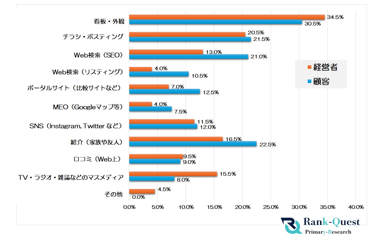 また、「チラシ・ポスティング」や「Web検索(SEO)」もそれぞれ20%前後を占めており、紙媒体による地域密着型の施策とオンラインの自然検索が共に顧客獲得に貢献しています。