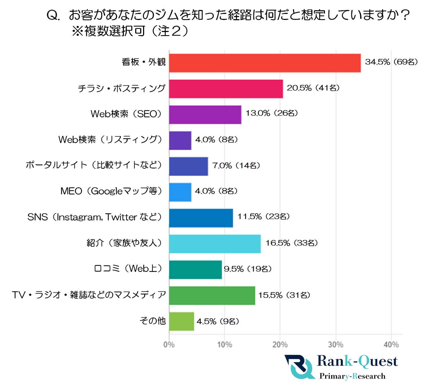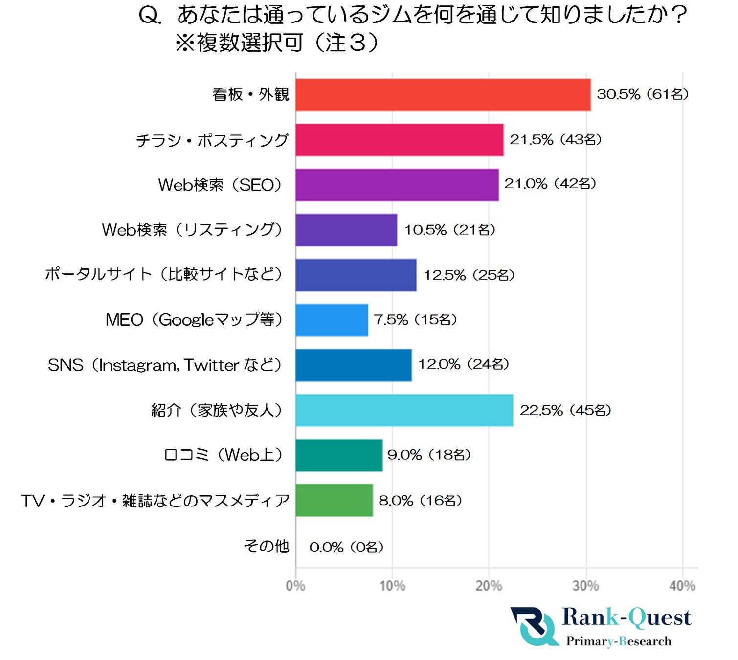 そこで、Google検索【SEO対策】で1位を獲得した実績(注1)を持つランクエスト(https://rank-quest.jp/column/column/how-to-seo/ )は、独立開業したフィットネスジム経営者200名と実際のジム利用者200名を対象に、『フィットネスジムを知ったきっかけ(認知経路)』に関する調査を実施しました。