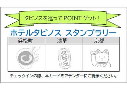 旅そして朝食のシーンをイメージしたタビノス浜松町、日本の祭りをイメージしたタビノス浅草、日本に由来のあるものを散りばめたタビノス京都と、個性豊かなホテルタビノス3館を是非この機会に巡ってみてはいかがでしょうか。 ▲スタンプラリー台紙(イメージ)