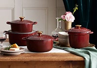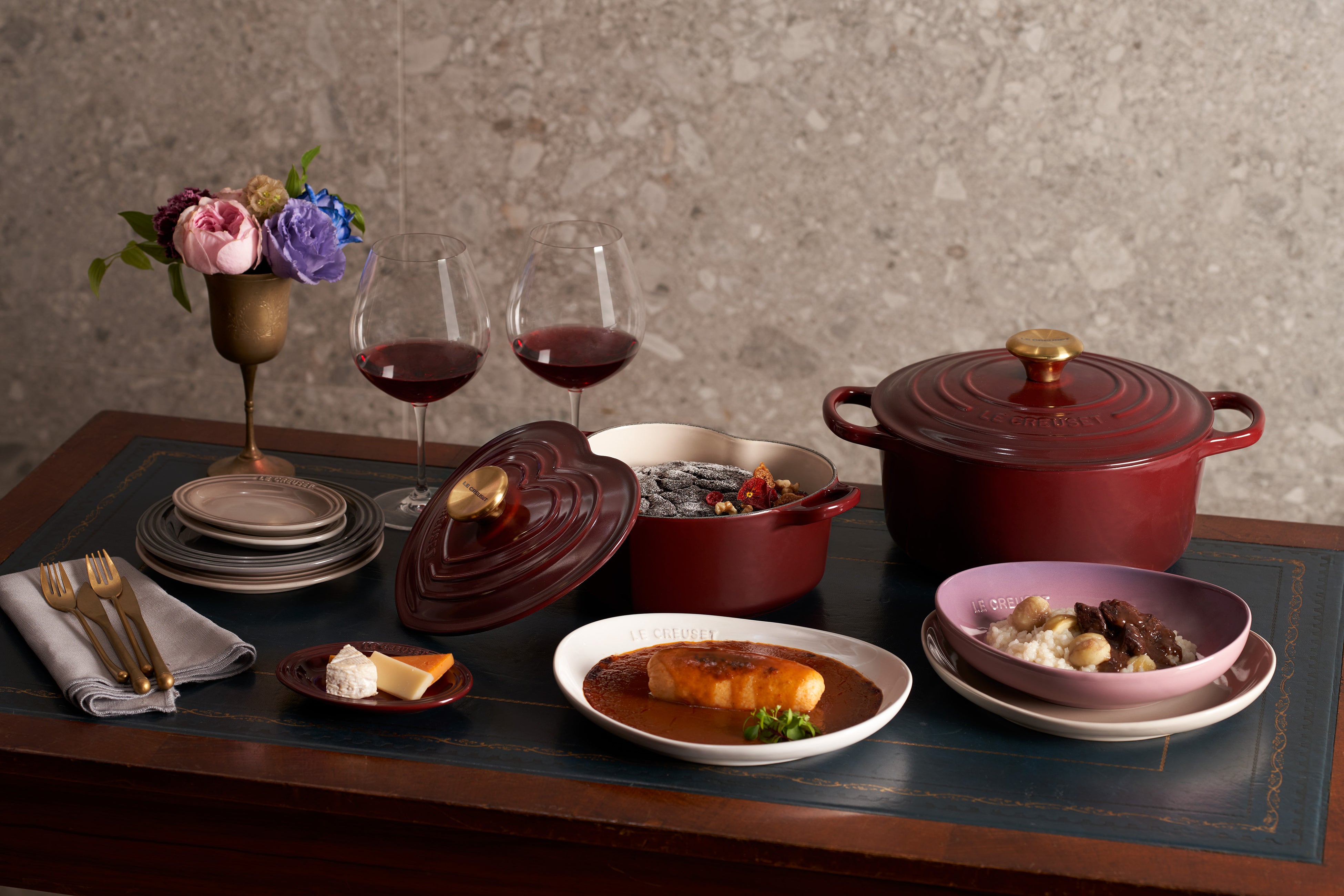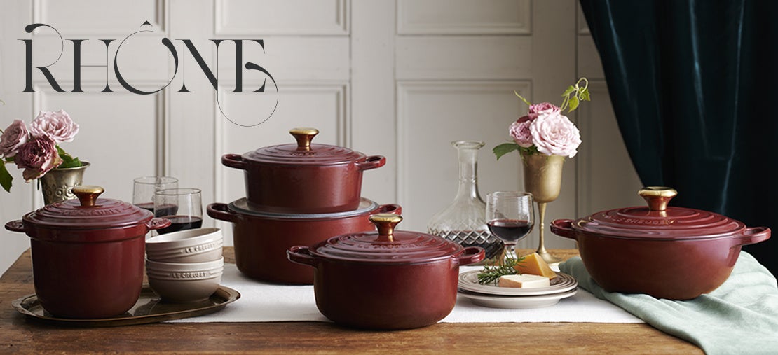 日ごとに秋の深まりを感じる10月は、ワイン用ブドウの収穫期。ル・クルーゼではフランスでも1,2を争うワインの産地ローヌ地方の名を冠した新色「ローヌ」を発売いたします。ローヌはワインのように深い赤にベルベットを思わせる光沢を加えた華やかなカラー。芳醇な味わいのローヌワインのように、食卓を豊かに彩ってくれます。「ナツメグ」や「ホワイト」などのニュートラルカラーと組み合わせると落ち着いた雰囲気に、同系の「モーブピンク」と組み合わせると甘くなり過ぎないフェミニンな印象のコーディネートに仕上がります。「ローヌ」の深みのあるレッドカラーはクリスマスや新年のテーブルコーディネートにも最適。食卓に深みと温もり、そして華やぎを加えてくれる「ローヌ」コレクションで、楽しい団らんの時間をお過ごしください。