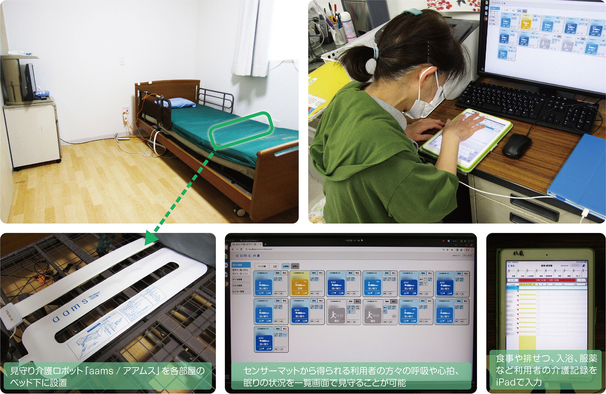 Wi-Fiを整備したことで、利用者の方々の見守りと並行して、スタッフは移動しながらノートPCやiPadで介護記録を入力できるようになりました。また、施設では見守り介護ロボットを導入しており、iPadやスマートフォンなどの業務用端末と連携した見守り体制を整えています。ベッド下にセンサーマットを設置することで、入居者の眠りの状態や呼吸、心拍などを測定し、iPadやスマートフォンを介してスタッフはリアルタイムに状況を確認できるようになりました。働き手となる人材の減少などの課題を解決するための手段としてWi-Fi整備と介護DX導入を推進し、業務の省力化と効率向上を実現しています。