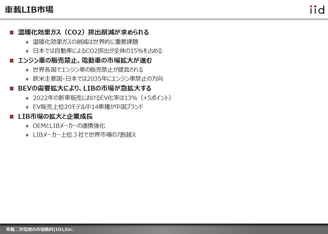 温暖化効果ガス(CO2)排出削減が求められる中、世界各国でエンジン車の販売禁止が提言され電動車の市場の拡大が進んでいます。BEV(Battery Electric Vehicle)の需要拡大によりLIBの市場は急拡大しており、2022年の新車販売におけるEV化率は13%(対前年比で+5ポイント)となり、EV販売台数上位20モデル中14車種が中国ブランドでした。OEMとLIBメーカーの連携が強化され、供給量上位3社のLIBメーカーで世界市場の7割以上を占めています。