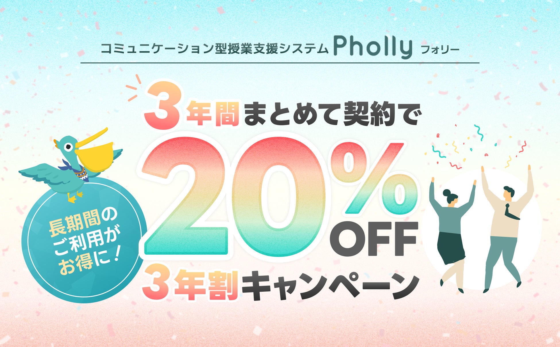 Mogic株式会社(本社:東京都練馬区、代表取締役:山根 陽一、以下 Mogic)は、コミュニケーション型授業支援システム「Pholly(フォリー)」の長期の利用でとってもお得な「3年割キャンペーン」を開催します。 3年割キャンペーンは、3年間の契約で利用料を20%OFFでご利用いただけるもので、最小プランだと月額費用16,000円から導入いただけます。