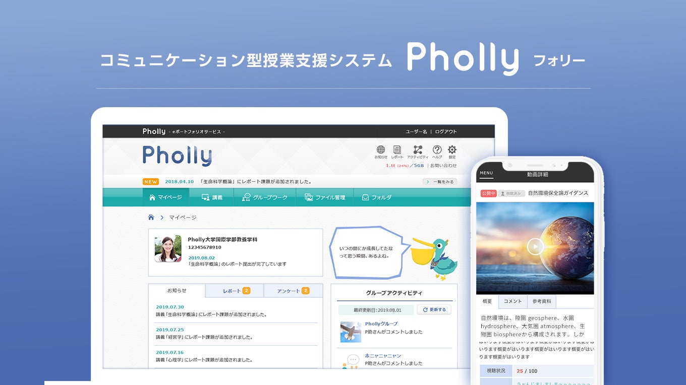 Phollyは、大学や専門学校などの教育機関を中心に導入が進んでいるコミュニケーション型授業支援システムです。Phollyを利用することで、学生が「いつでも、どこでも、どんな端末でも」レポート提出やグループワークなどのオンラインで学習でき、教職員も管理画面から出席の確認、レポートやテストの評価、グループワークへの参加などオンラインを活かし業務負荷を大幅に低減することができます。