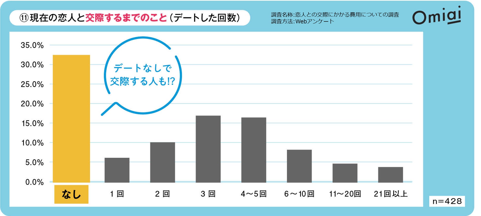 20代女性は、付き合うまでにデートを6回も重ね、しかも1 回当たり10,000円も使っているという驚きの結果が判明しました。逆に、デート費もかけずに、すぐ付き合ってしまうというデータが出たのは40代男性。平均2.8回で付き合っているのは、コスパに長けた成功率とでも言うべきなのでしょうか。付き合うまでのデートの回数は、男女ともに3回が多いですが、それよりも多いのが「なし」という結果(グラフ⑪)。デートをせずに付き合った人が、3割もいることが判明しました。