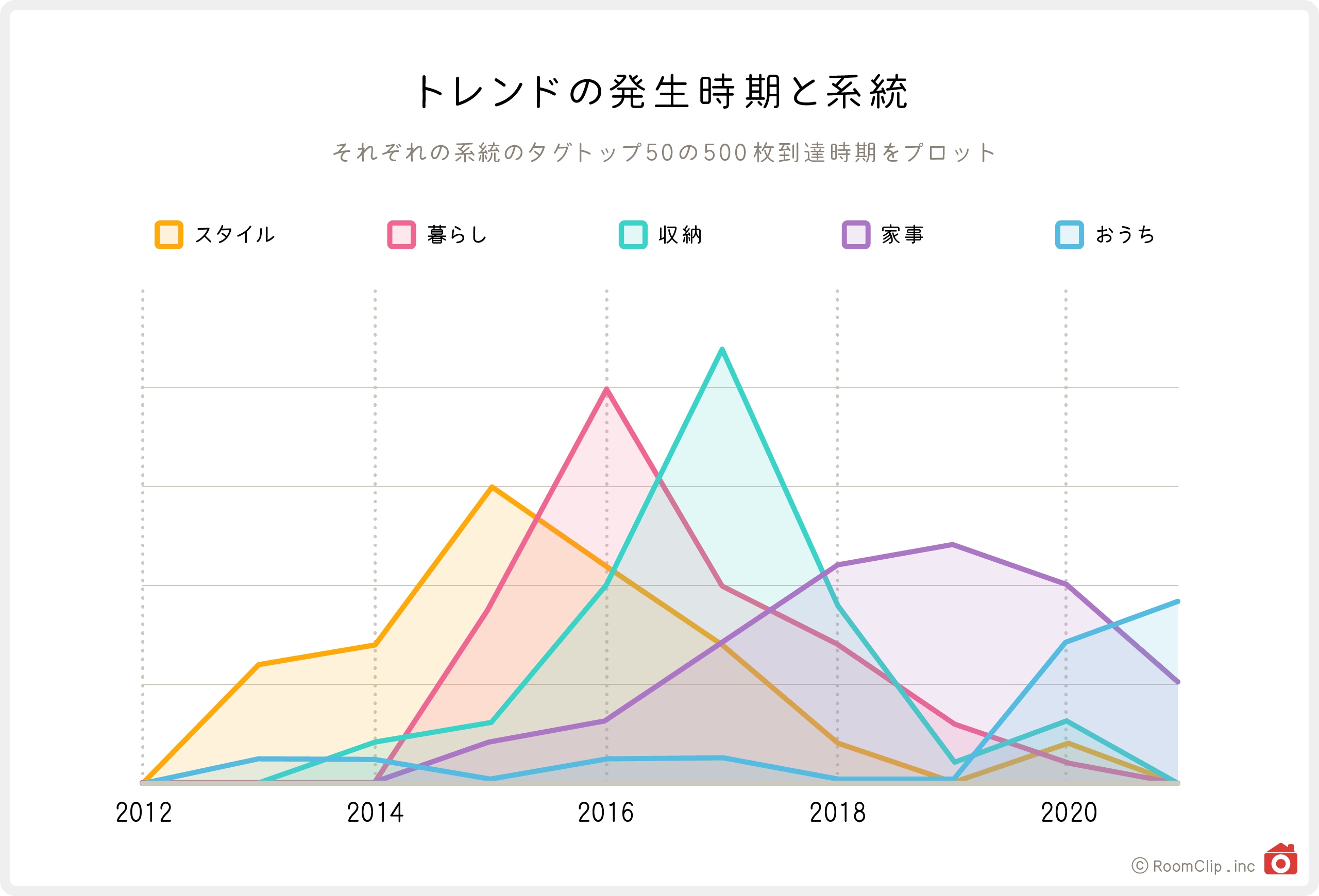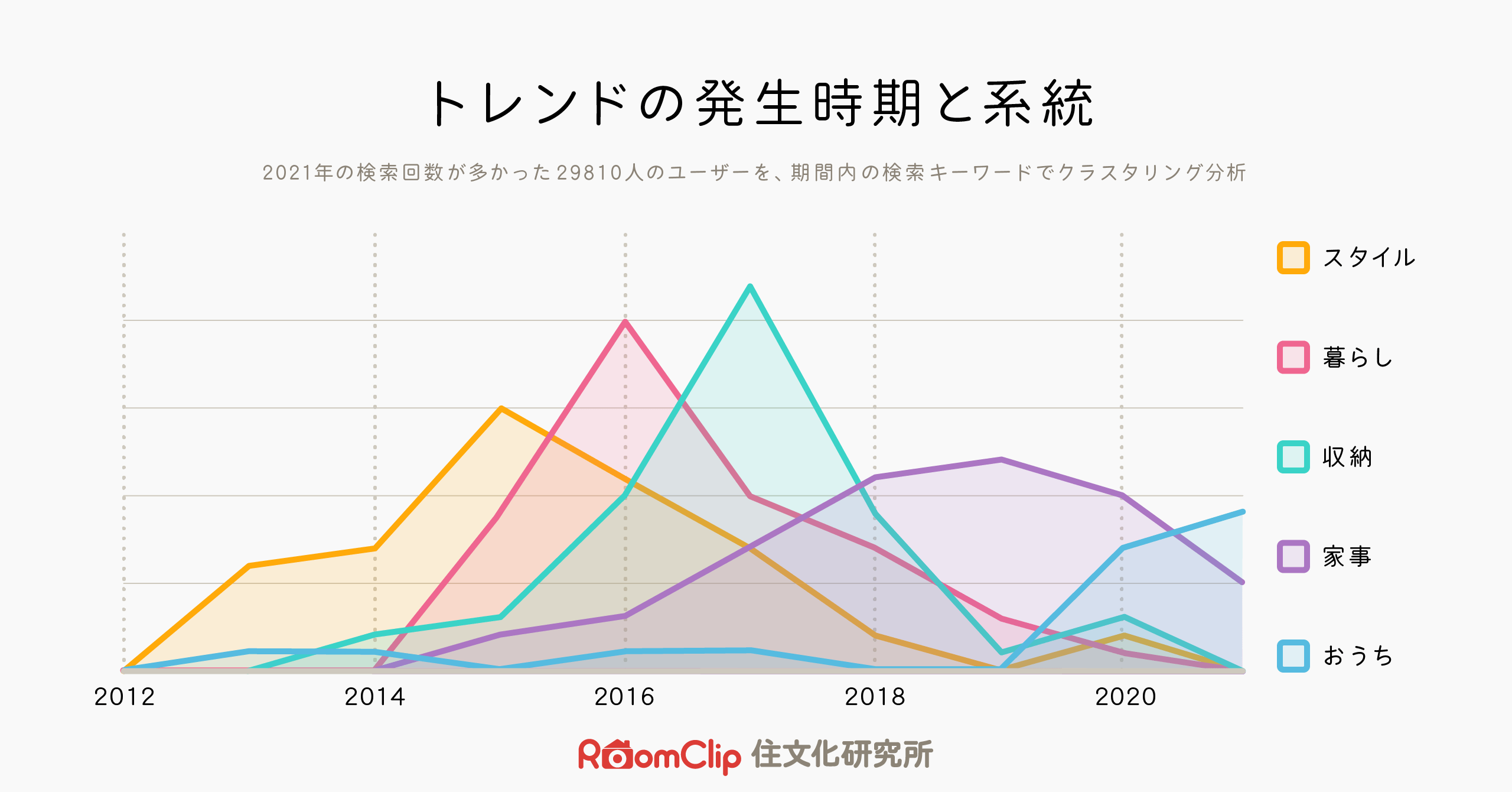 1つ目の図は、5つのトレンドを5色に分け、まとめたものです。SNS普及の全盛期にかける「映え」潮流と連動してスタイル系トレンドが2013年頃から発生し、その後、スタイルの実現や暮らしの維持を支えるノウハウである収納を下支えとして、暮らし系トレンド、家事系トレンド、おうち系トレンドが誕生し、順番にピークが移り変わっていったことがわかります。