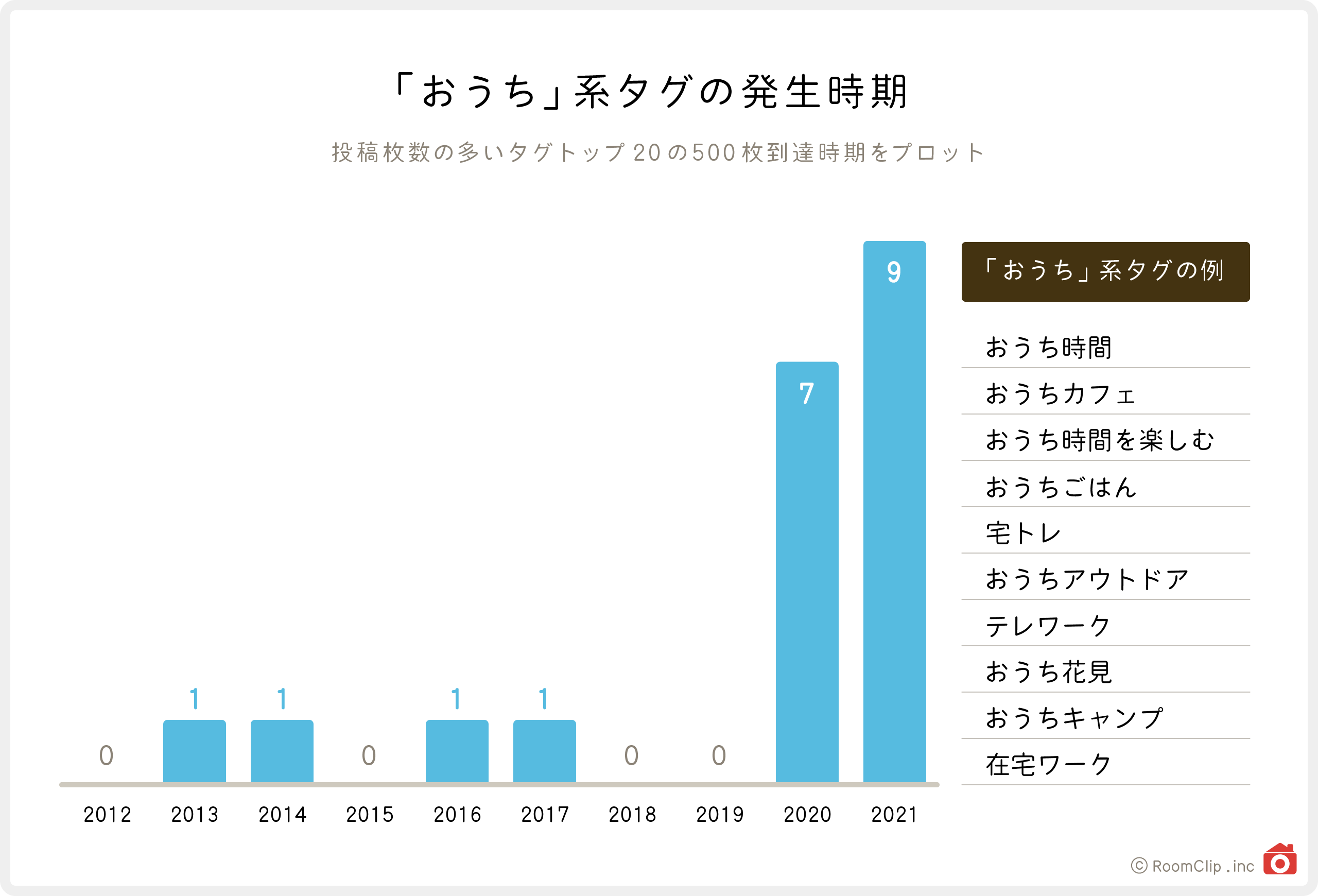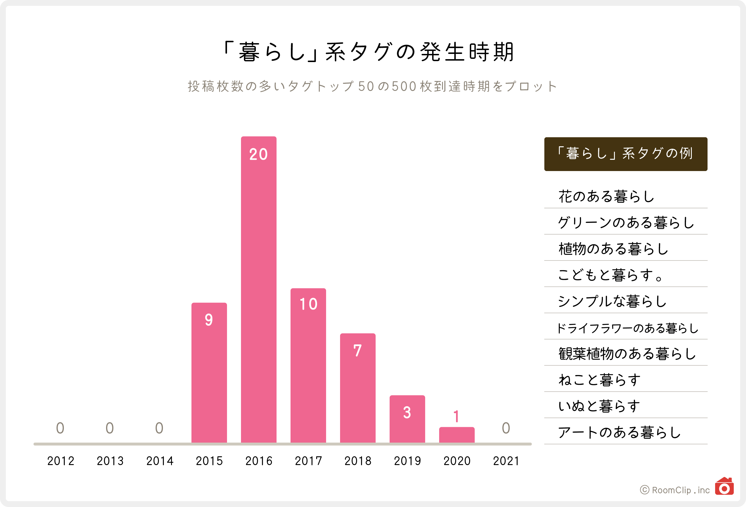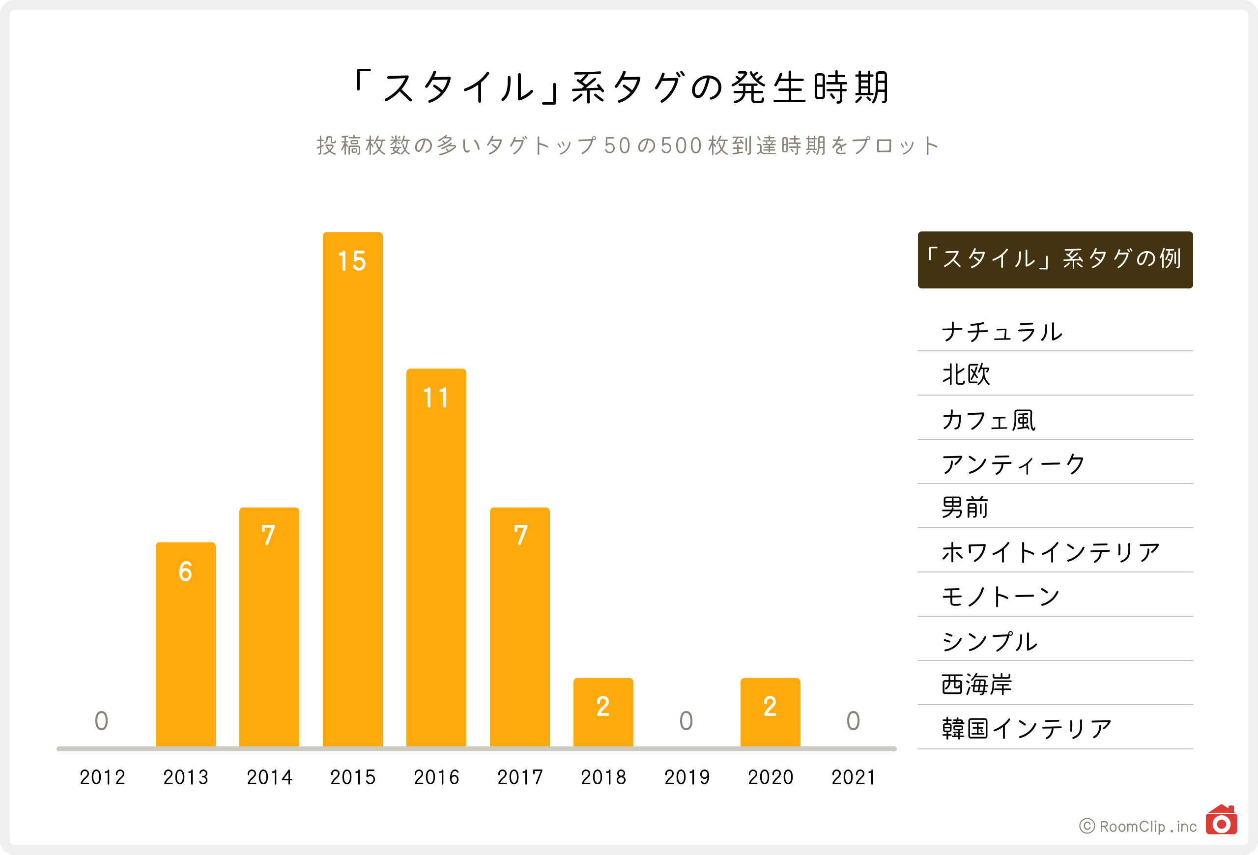 上のグラフは、スタイル系のタグの中で投稿枚数が多いトップ50が500枚に到達した時期をカウントしたものです。2013年から2015年をピークに、2017年頃までにその大半が発生していることがわかります。 2017年以降になると、トップ50に含まれるボリュームの大きなインテリアスタイルはあまり発生していません。唯一目立ったスタイルとして、2020年頃に「韓国インテリア」が発生しています。