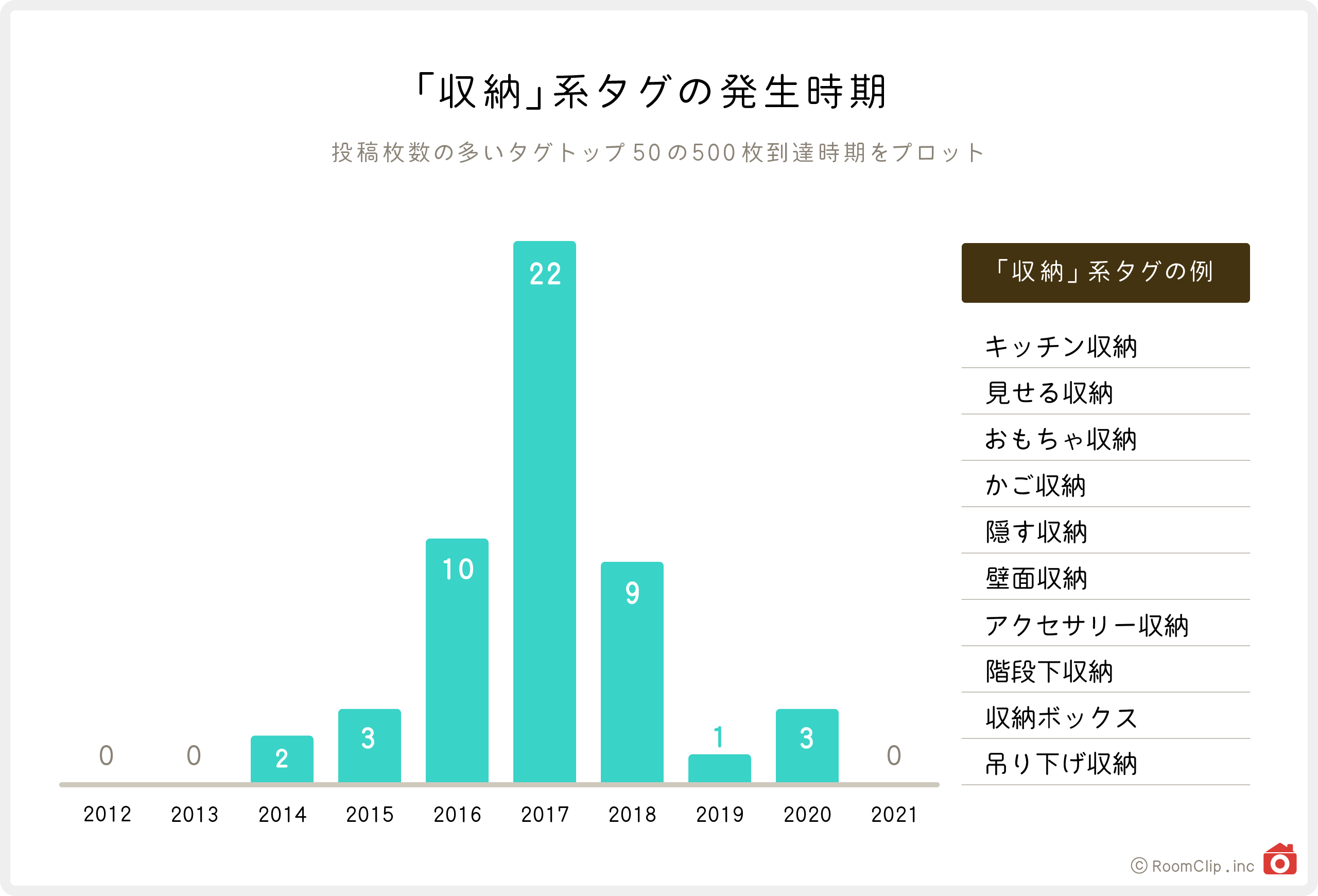 スタイル系の盛り上がりを追うように始まり、その後も2014年から2017年にかけて継続的に新しいキーワードが発生したのが収納系トレンドです。何か新しいトレンドが発生するたびに、それの下支えとなる「舞台裏」的な立場で収納トレンドが継続的に発生しました。