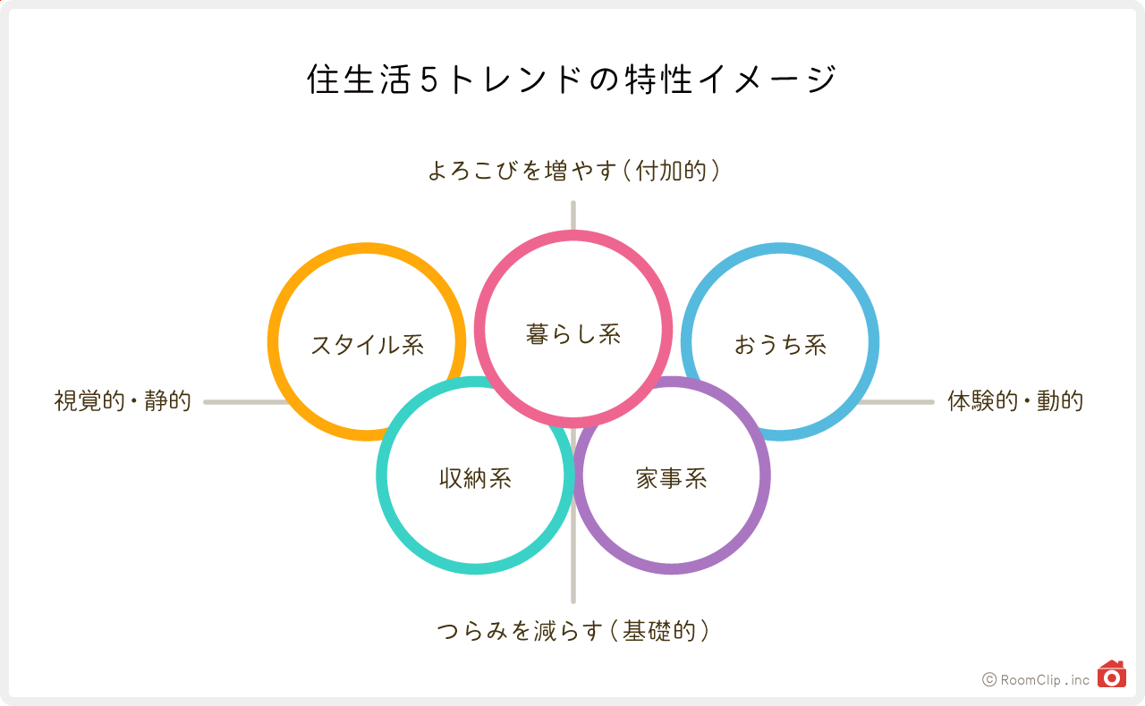 これらの要素に応じて5トレンドを置くと、発生の時系列順に連動して左から右へスタイル系→収納系→暮らし系→家事系→おうち系の順に付加的なトレンド、基礎的なトレンドを行ったり来たりする配置となります。言い換えれば、住生活のトレンドはよろこびの増幅とつらみの軽減を繰り返しながら視覚的なものから体験的なものへニーズが移り変わっていったと捉えられます。