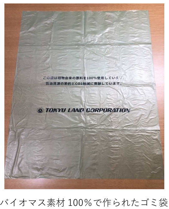 また、株式会社都市環境エンジニアリング、株式会社ショーエイコーポレーションと協業し、共用部で使用するゴミ袋を、植物由来の原料で製作しました。本ゴミ袋はバイオマス素材100%※3で作られており、通常のゴミ袋よりCO2排出量が約70%削減できます。2022年12月より、2物件(渋谷ソラスタ、新目黒東急ビル)の可燃ごみのゴミ袋として利用しています。