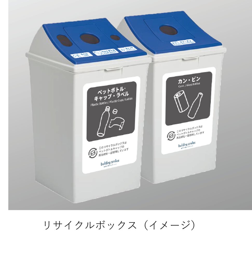 キリンビバレッジ株式会社(以下、「キリン」)と協業し、共用部に設置する二種類のリサイクルボックス(①ラベル・キャップ・ボトルに分別可能なペットボトル用、②カン・ビン用)を、ペットボトルキャップを原料として製作に取り組みました。キリンと当社が2022年11月~2023年3月の5ヵ月間で、ペットボトルキャップ約234kg(約117,000個相当)を回収、リサイクルボックス76基を作成し、2023年3月、5物件(新目黒東急ビル、渋谷南東急ビル、日本橋フロント、品川東急ビル、恵比寿ビジネスタワー)に設置します。
