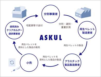 使用済みクリアファイルの回収と再資源化は、アスクル株式会社(本社:東京都江東区、代表取締役社⻑:吉岡 晃、以下「アスクル」)が運営する「アスクル資源循環プラットフォーム※1」(以下「資源循環プラットフォーム」)を活用しました。