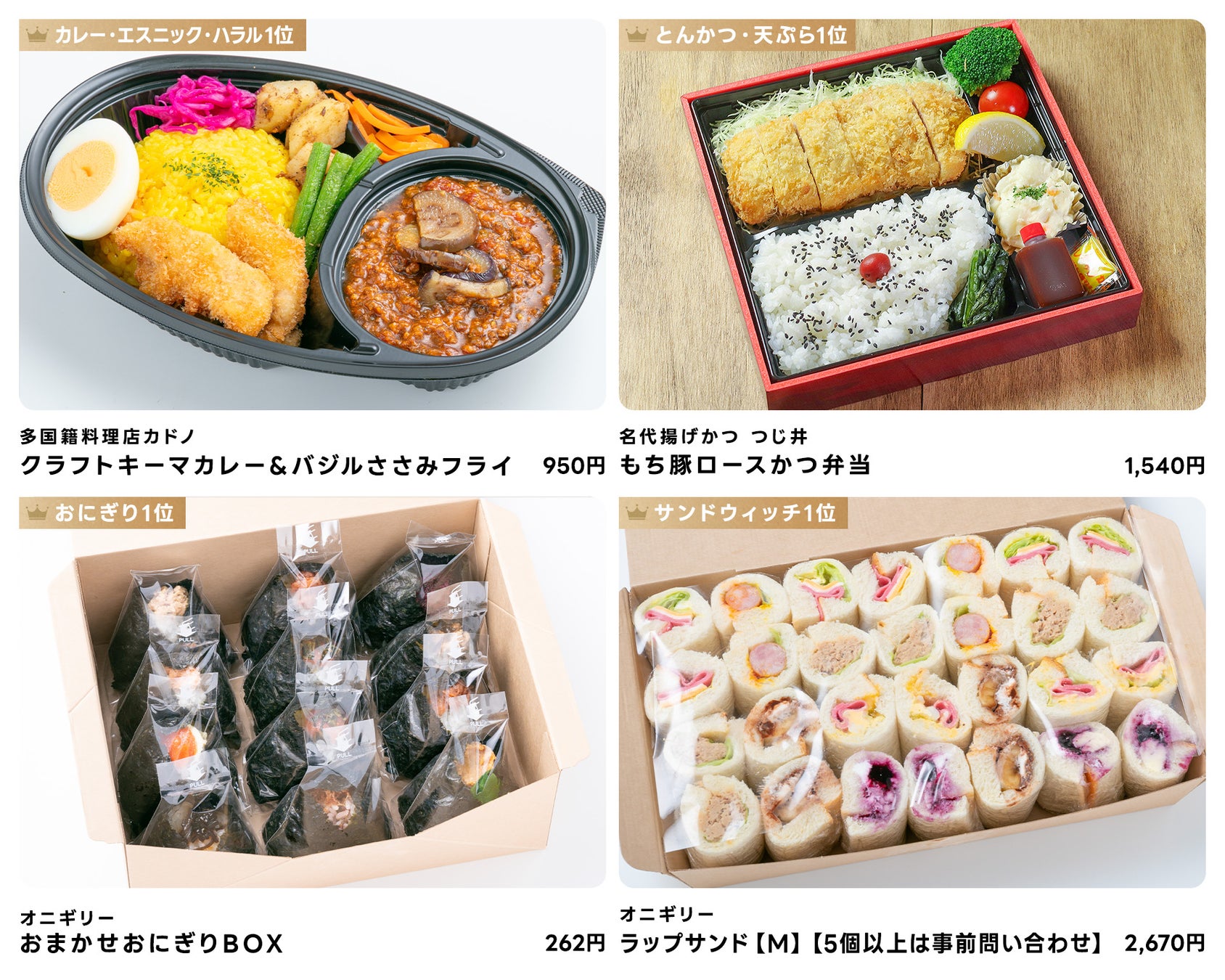 「<ジャンル別>新店ランキング」では、八丁堀の多国籍料理ビストロ「カドノ」がカレージャンルに、麻布十番に本店を有する「楽万コロッケ」が洋食ジャンルにランクインするなど、飲食店の味わいが楽しめるお弁当が評価されました。おにぎり・サンドウィッチジャンルでは、大勢でシェアする商品がランクインし、ビジネスのシーンで差し入れとしてデリバリーを利用する機会が増加していると考えられます。