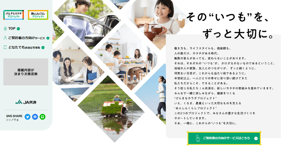 [事業内容] 共済事業:ひと・いえ・くるまの総合保障および保障と一体的なサービスの提供
