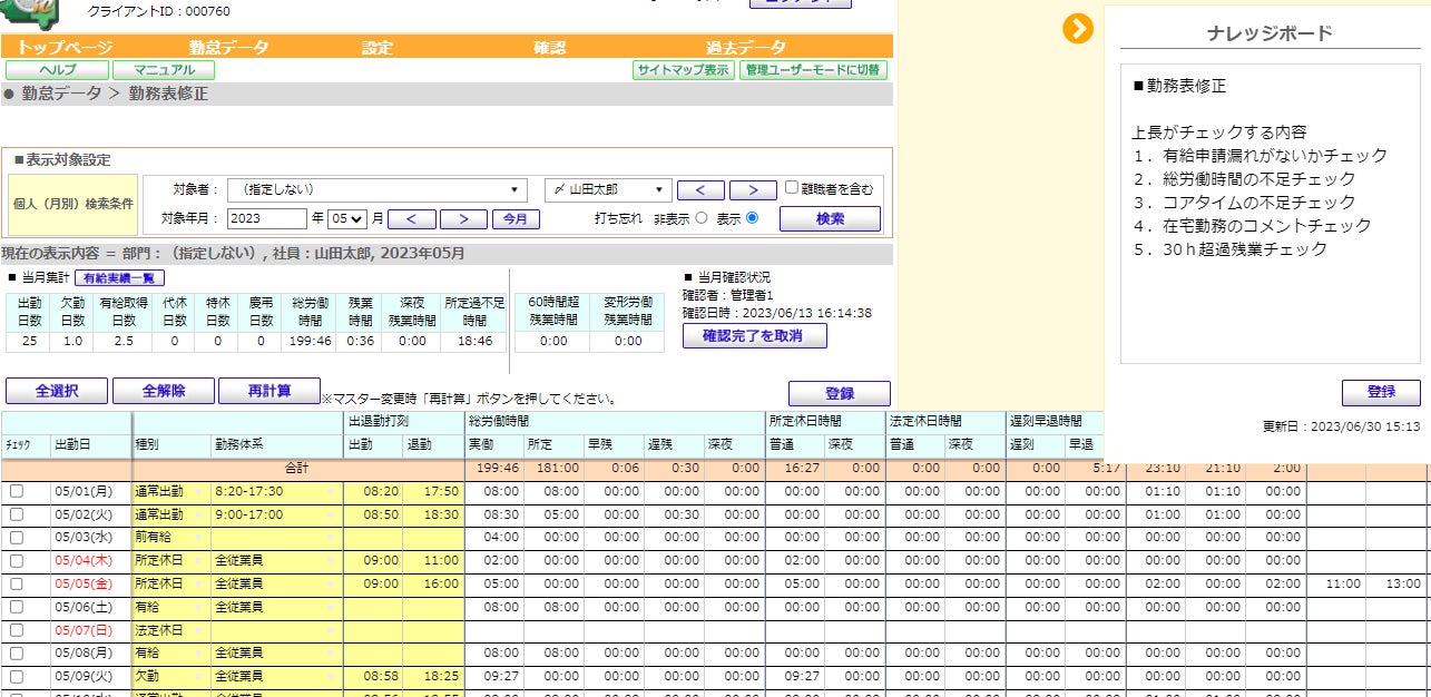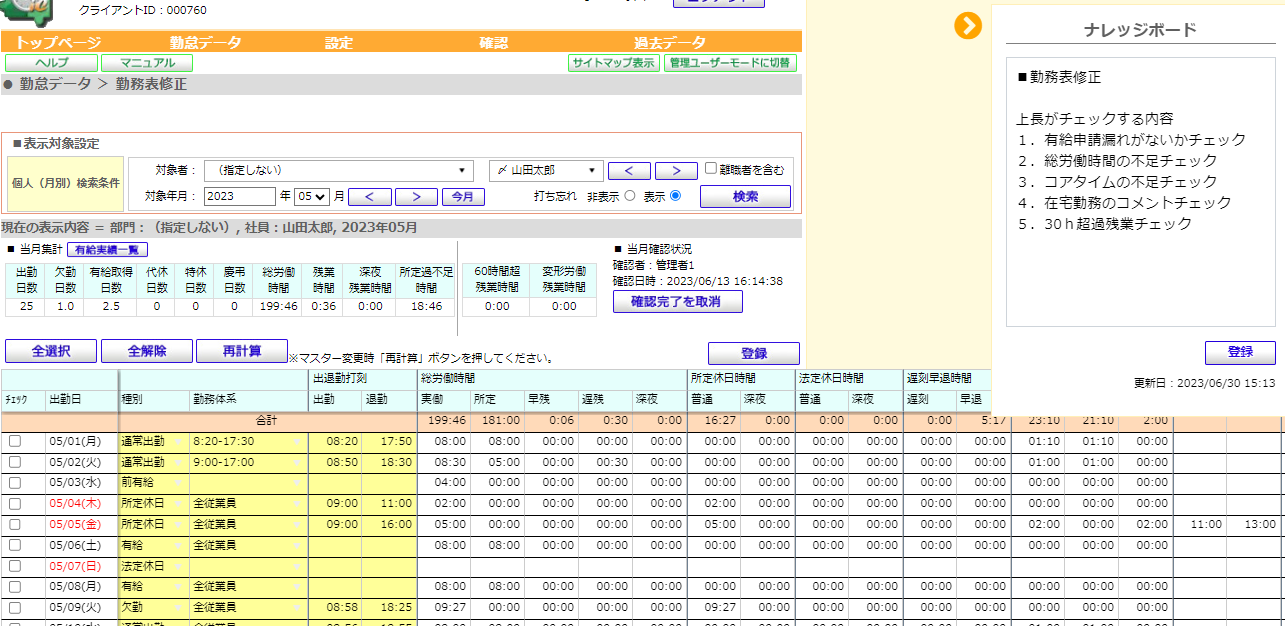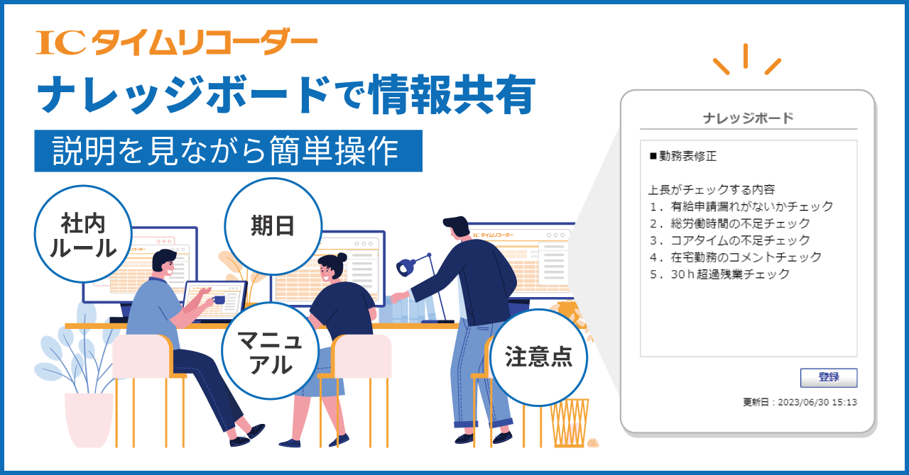 毎日社員が利用する勤怠画面に「ナレッジボード」が設置され勤怠ルールや注意点、申請/承認の「説明を見ながら」行うのでミスが少なく正しい勤務表を作っていく事ができます。また社内の勤怠ルール改正時はすぐに最新のルールを社員へ共有するので全社員へ統制が可能です。「ナレッジボード」はルール、マニュアル、作業の期限などの重要な説明を全社員へ統制し、「説明を見ながら」操作するので業務統制・効率化、ミス・漏れ、期限遅れの問題を改善します。
