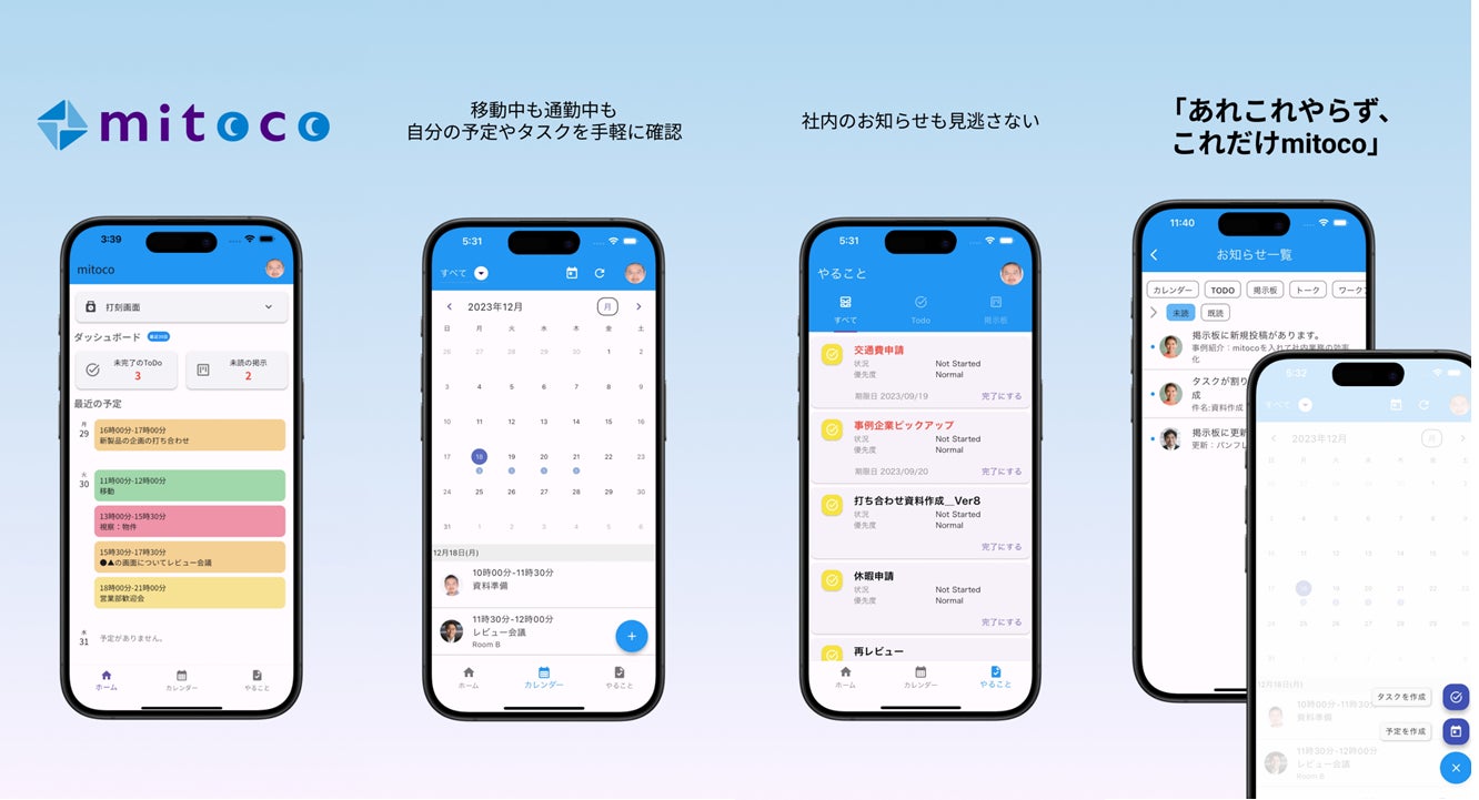 「mitoco Mobile」を使用すれば、mitoco 掲示板や mitoco カレンダー、mitoco ToDo の内容を、ひとつのモバイルアプリで今日のみること・やることとして確認することができます。