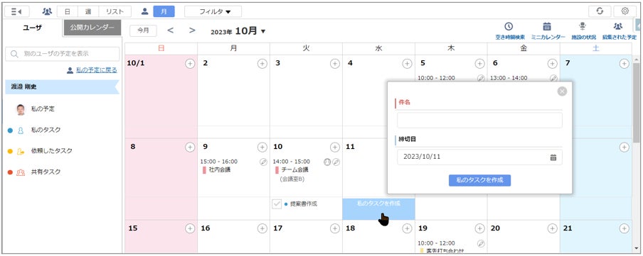 カレンダーの月表示でも、週表示などと同様にタスクの表示と簡易作成ができるようになりました。