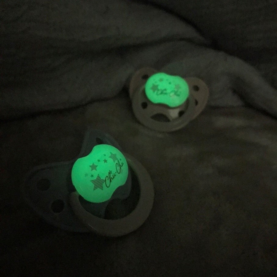 蓄光タイプは光を吸収して暗闇で台座が光る(吸収時間によって発光する時間は異なります)。バッグから取り出すときや夜間に使用する際、どこにおしゃぶりがあるかわかるので便利です。